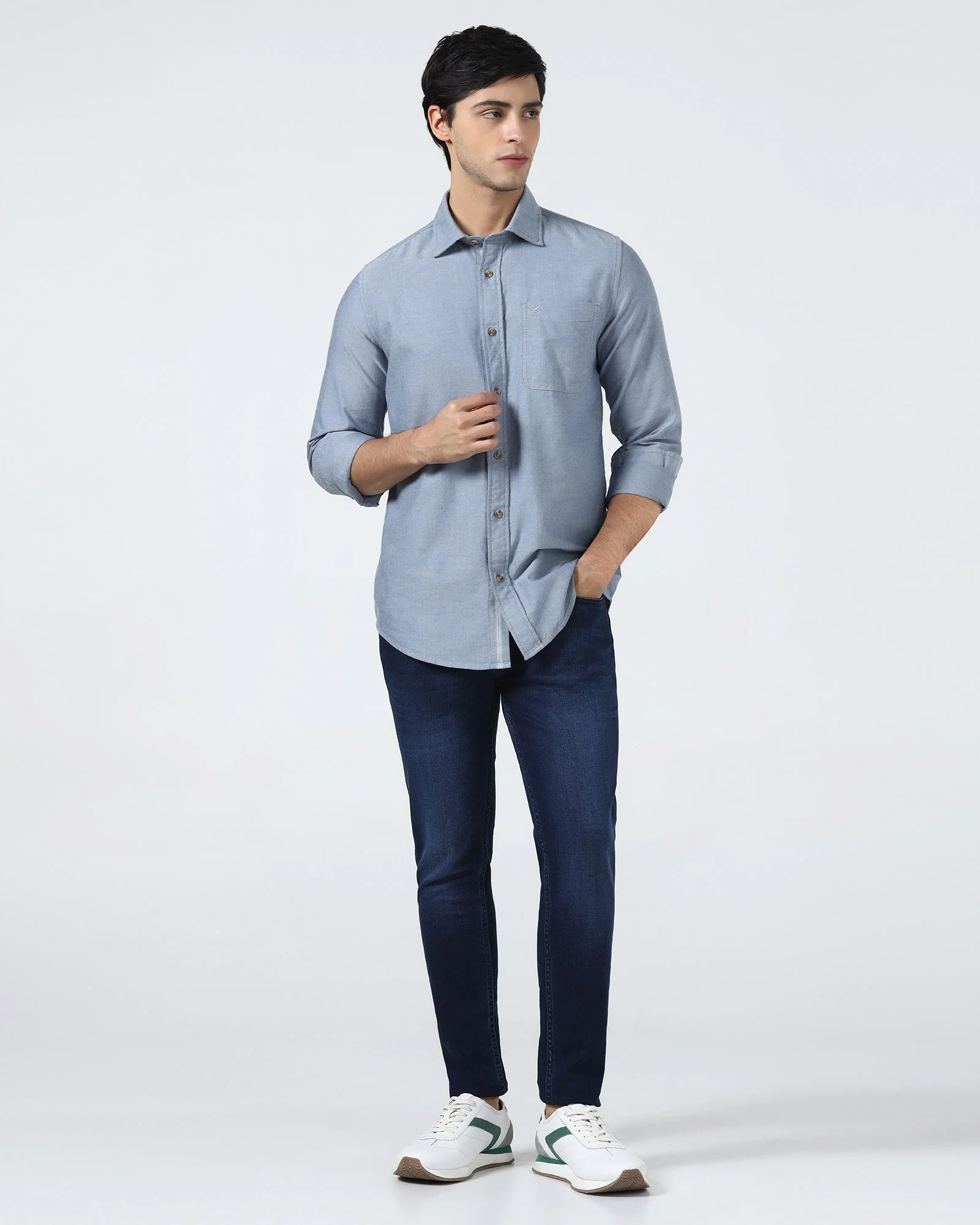 Blue shirts will always be applicable to a modern man’s wardrobe. They anchor everything — denim, chinos, tailoring. This India (Slim Comfort) fit version keeps it sharp through the shoulders, clean through the body. The semi-cutaway collar adds a contemporary edge; the box placket and chest pocket keep it grounded. Woven in 100% cotton twill, it feels structured yet breathable. It’s not just another shirt. It’s the one you’ll rely on!