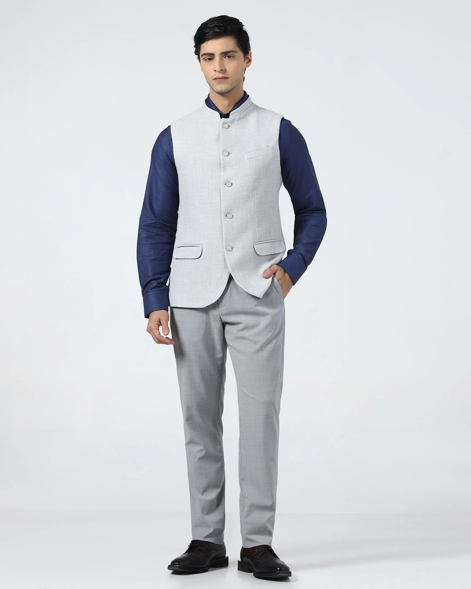 Layering in the summer? This is how you do it without weighing yourself down. Light grey keeps this Bandhgala sharp and adaptable. The tactile texture adds depth you notice up close. Cut in a slim silhouette, it shapes the torso cleanly and instantly elevates. Lightweight, stretch-infused, effortless to wear all day. It’s the kind of piece that makes your outfit look thought through — even when you didn’t overthink it!