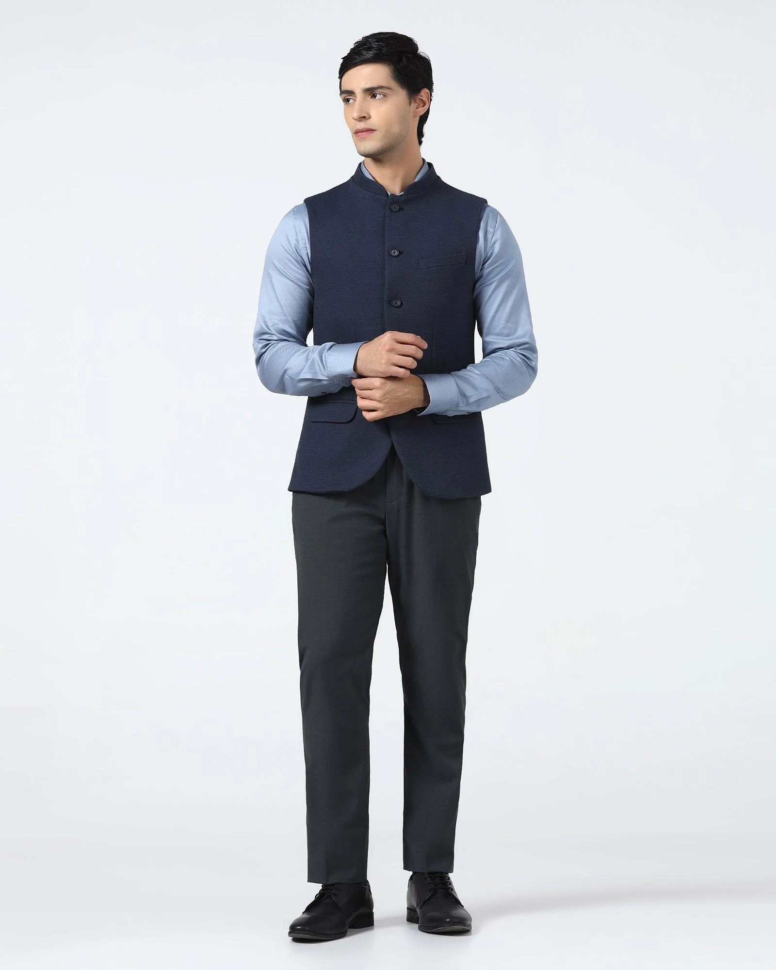 Now, this is a piece worth investing in! Navy gives you range — formal when you need it, relaxed when you want it. The slim Bandhgala cut creates the sharpest of profiles. Add to that, the mandarin collar brings that structured edge modern wardrobes demand. Crafted in a stretch knit blend, it’s built for long days and warmer evenings No matter which way you style it, it always earns its place!