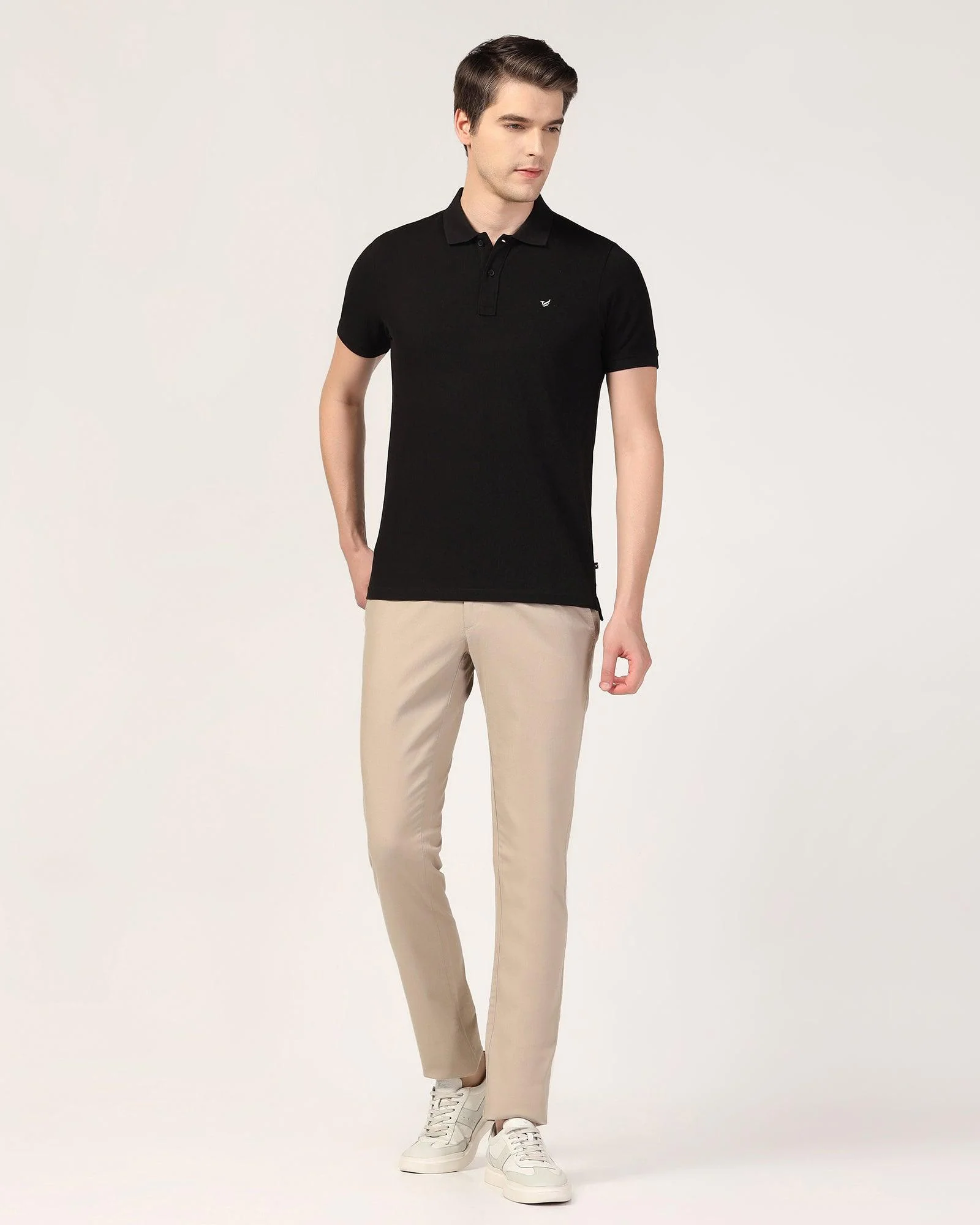 Unveil the essence of refined elegance with this Black Polo T-Shirt, the epitome of refined casual wear. Tailored to a slim fit, it boasts excellent stretchability for unparalleled comfort. Crafted from knitted fabric in a timeless black hue, this t-shirt for men features a classic solid pattern and short sleeves, ensuring versatility for any occasion.