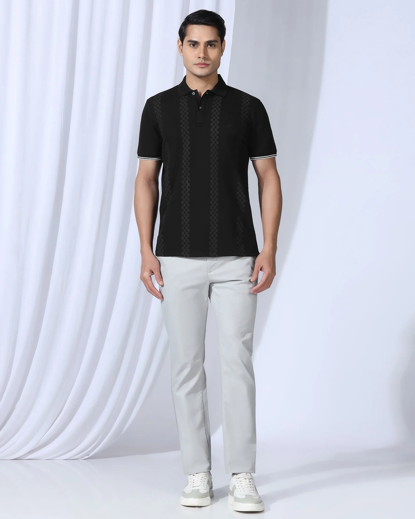 Reimagine casual classiness with the Printed Polo Neck T-Shirt, a blend of comfort and chicness. Made from pique knit fabric, it provides a smooth texture with a stretchy slim fit for freedom of movement. With half sleeves and a button fastening, this t-shirt provides a neat appearance.
