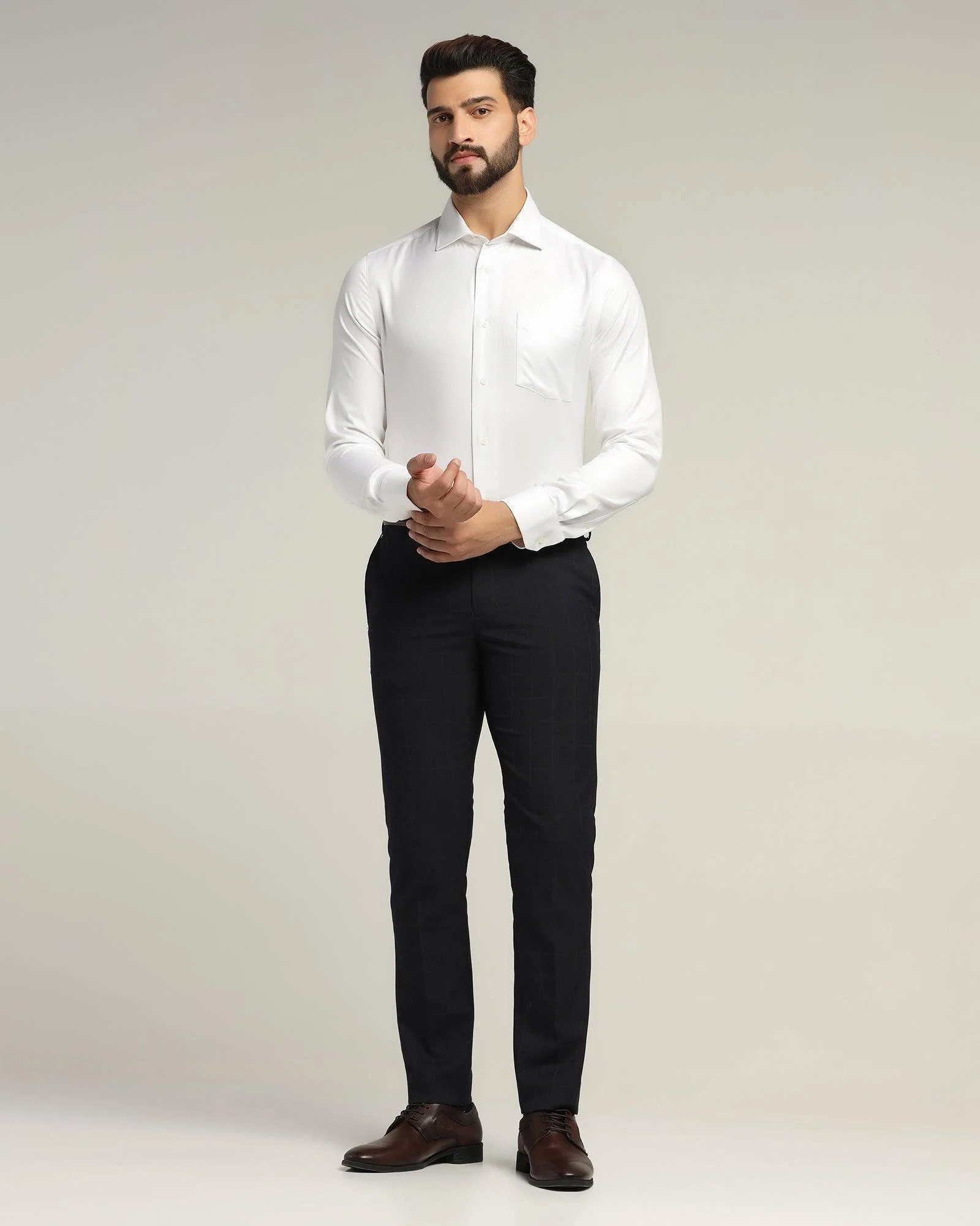 Step into sophistication and elegance with this Super White Textured Formal Shirt. This shirt features pucker-free seams and fully taped construction, ensuring a smooth and immaculate look. The Super White’s unparalleled brightness lies in the sophisticated use of optical brightening agents (OBAs), integrated during fabric dyeing. These agents enhance the shirt’s whiteness by absorbing ultraviolet light and re-emitting it as blue light for a radiant finish and a whiteness index of 160+ on the CIE scale.