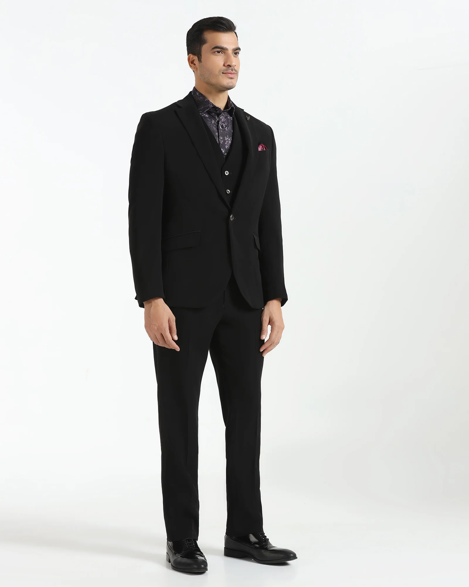Formal, contemporary and sophisticated, the Black 3-Piece Ceremonial Suit is a real masterpiece. For the groom and for the best man, this is a slim-fit wedding suit for men. The one-button single-breasted jacket, matched waistcoat, and mid-rise trousers are created to perfection in premium woven fabric for superior comfort and an incredibly sharp silhouette. The notch lapel, flap pockets, and dark black tone make it an impeccable choice for wedding collections.