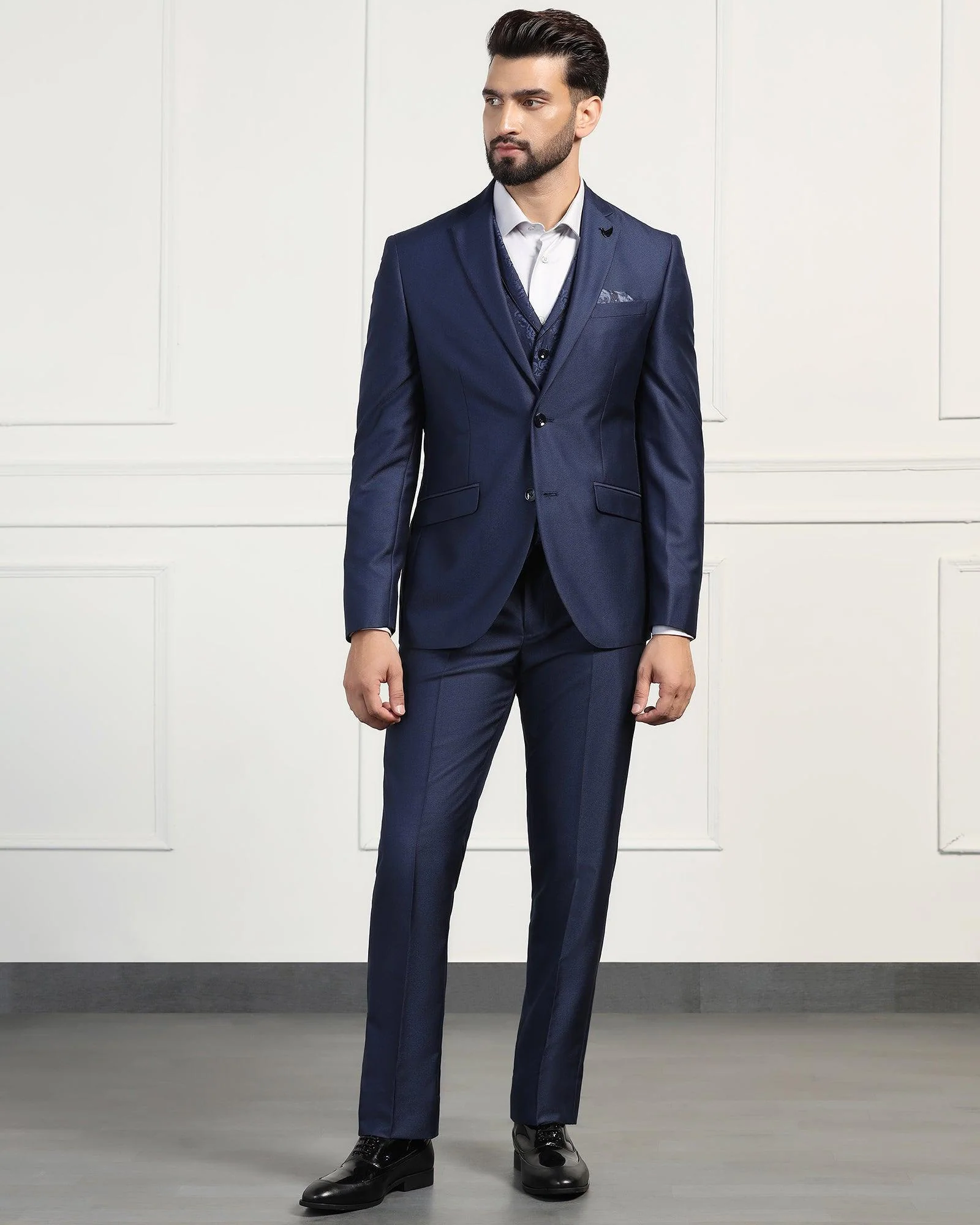 Make a classy statement with the 3-Piece Formal Suit, crafted in textured dobby fabric for a distinguished look. Featuring a reversible waistcoat and B-91 (slim) fit trousers, it blends versatility with a chic and modern style. The stretchable waistband adjusts to your waistline for all day comfort.