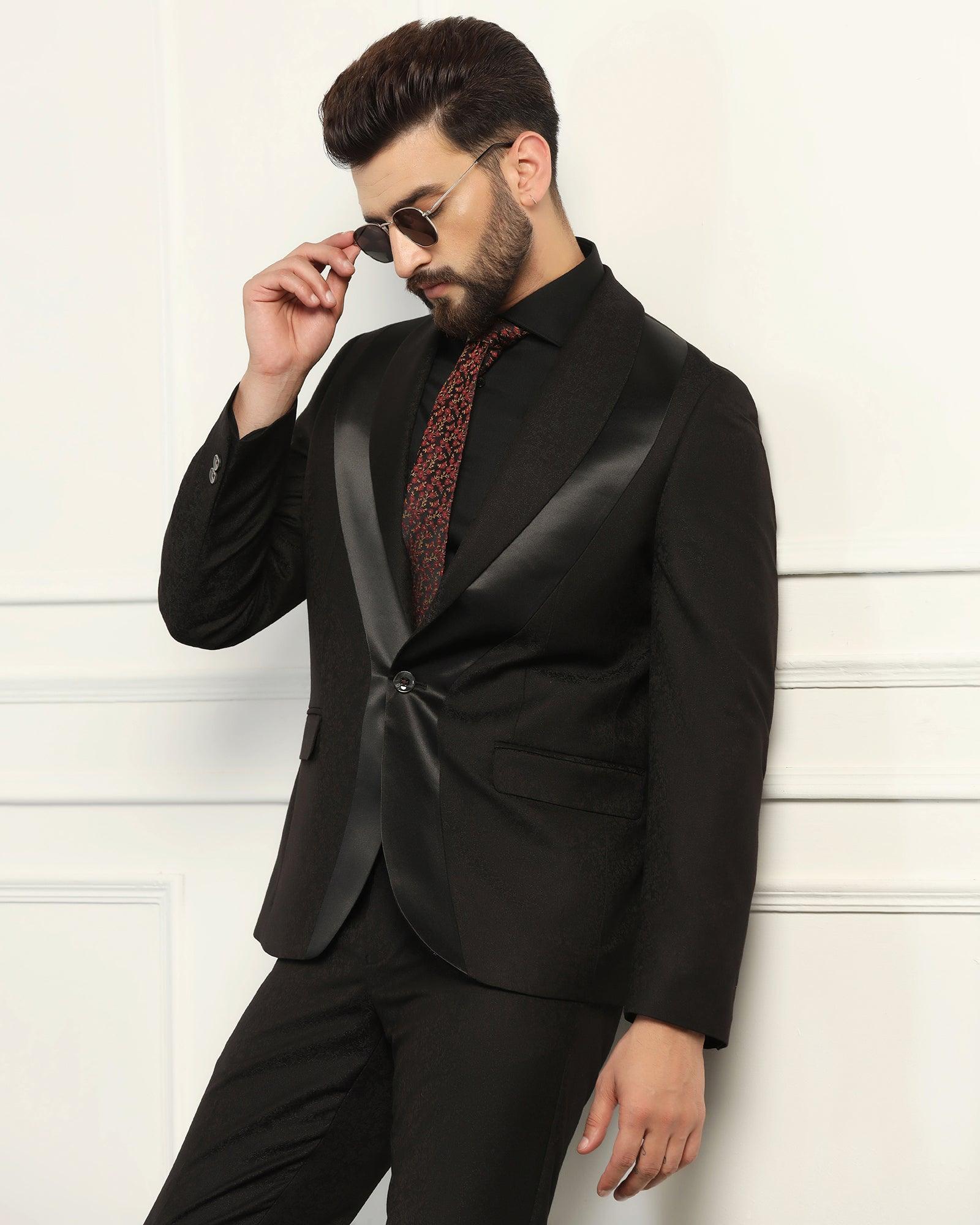 Upgrade your style with the Formal Suit, a masterpiece of premium craftsmanship. Designed from woven jacquard material, it features a slim fit for premium craftsmanship, exuding rich colour and high-quality fabric. The refined shawl collar and flap pockets add a touch of sophisticated grace.